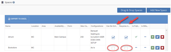 The screen below is from Event Scheduler under Settings > Basic > Spaces and shows where the setting for "Can Be Scheduled" is.