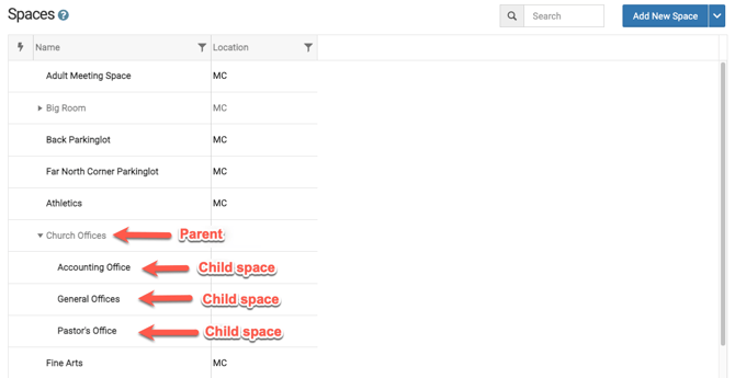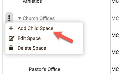 To add a new space as a "child" or sub-space of another, hover over the intended "parent" space click on the three dots and then select "Add Child Space".