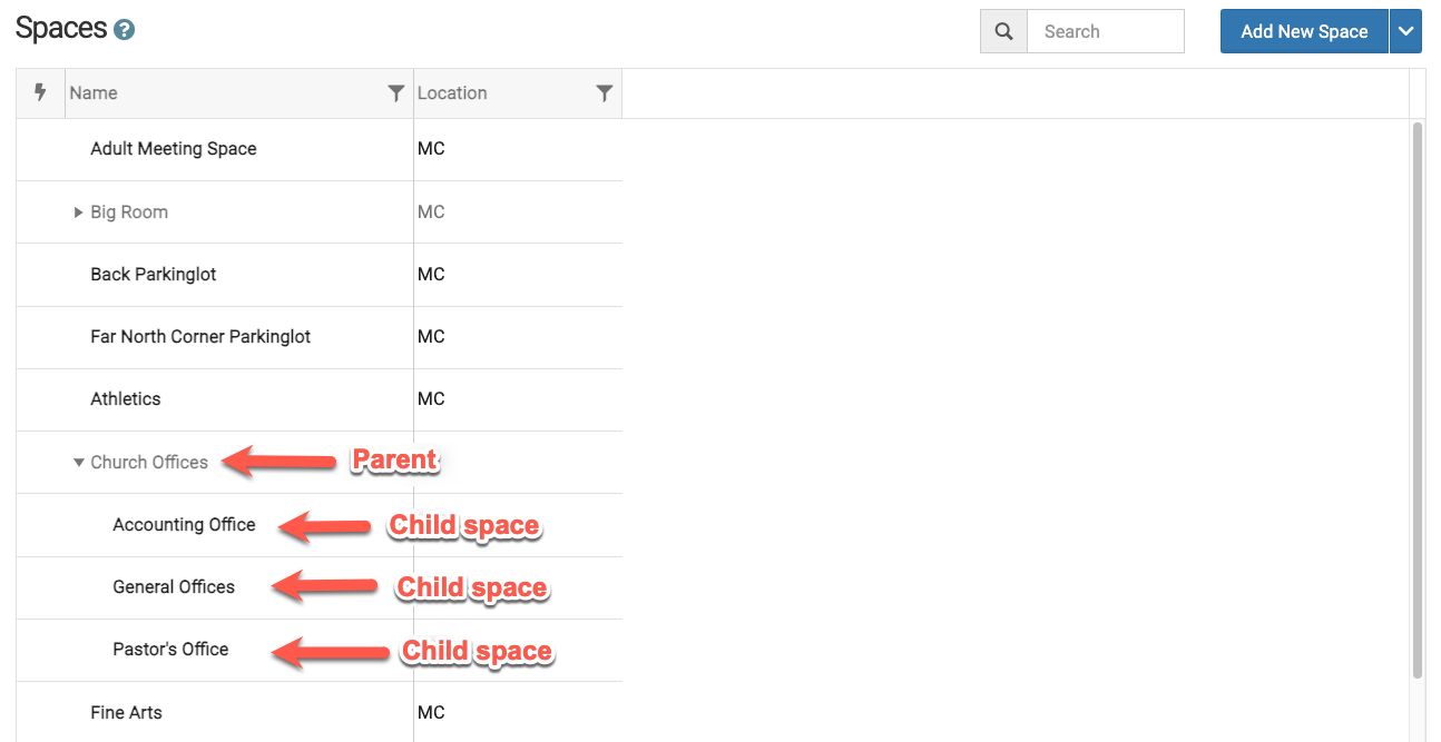 When adding new spaces, you can start building a “hierarchical tree”. For example, "Building A" and then add “children” (sub-spaces) to the hierarchical tree, such as the floors, or rooms in that building. When referring to a hierarchical tree, a “parent” is considered the top node and the “child” is the item under/within the “parent”.
