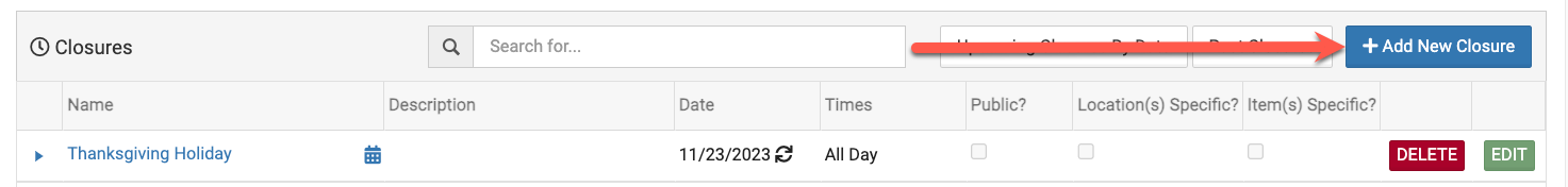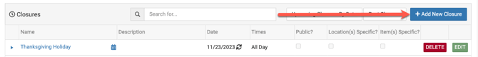 - Go to Settings > Advanced > Availability > Closures, then select “Add New Closure”.