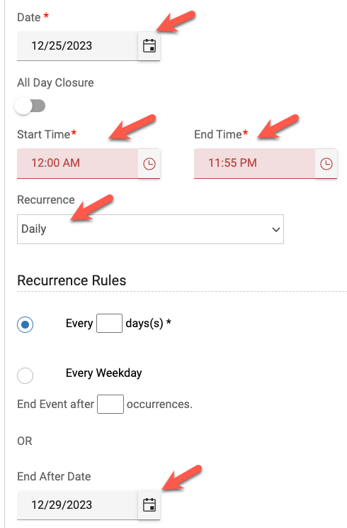 - Next, add the closure date and select if you want it to be an all day closure OR start and end at a specific time. You can also make the closure with recurrence rules (daily, weekly, monthly, yearly, custom).