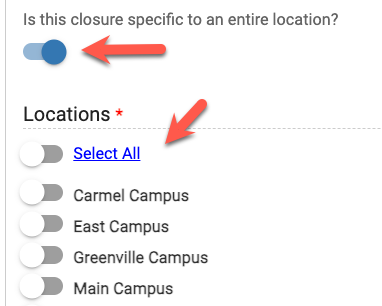 - However, if you only want the closure to apply to specific location, then toggle on "Is this Closure Specific to an Entire Location" and then choose the locations that need to be affected by the closure. Once you select a location then all the spaces, resources and services at that location will be unavailable to reserve on events.
