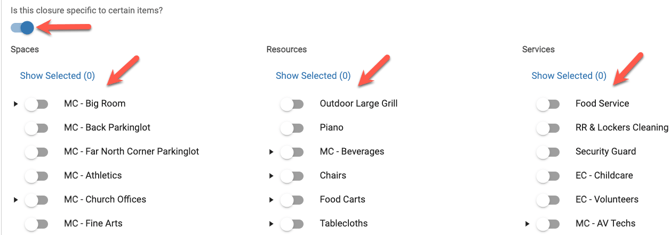 - If your closure is “item specific” (for spaces, resources, or services), then be sure to enable "Is this Closure Specific to Certain Items" and then choose what items at different locations are needed.