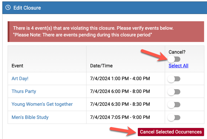 Once that you have completed the form, all affected event occurrences will be displayed. You can choose the Select All button or only select a few of the events that you want to cancel, then select Cancel Selected Occurrences.