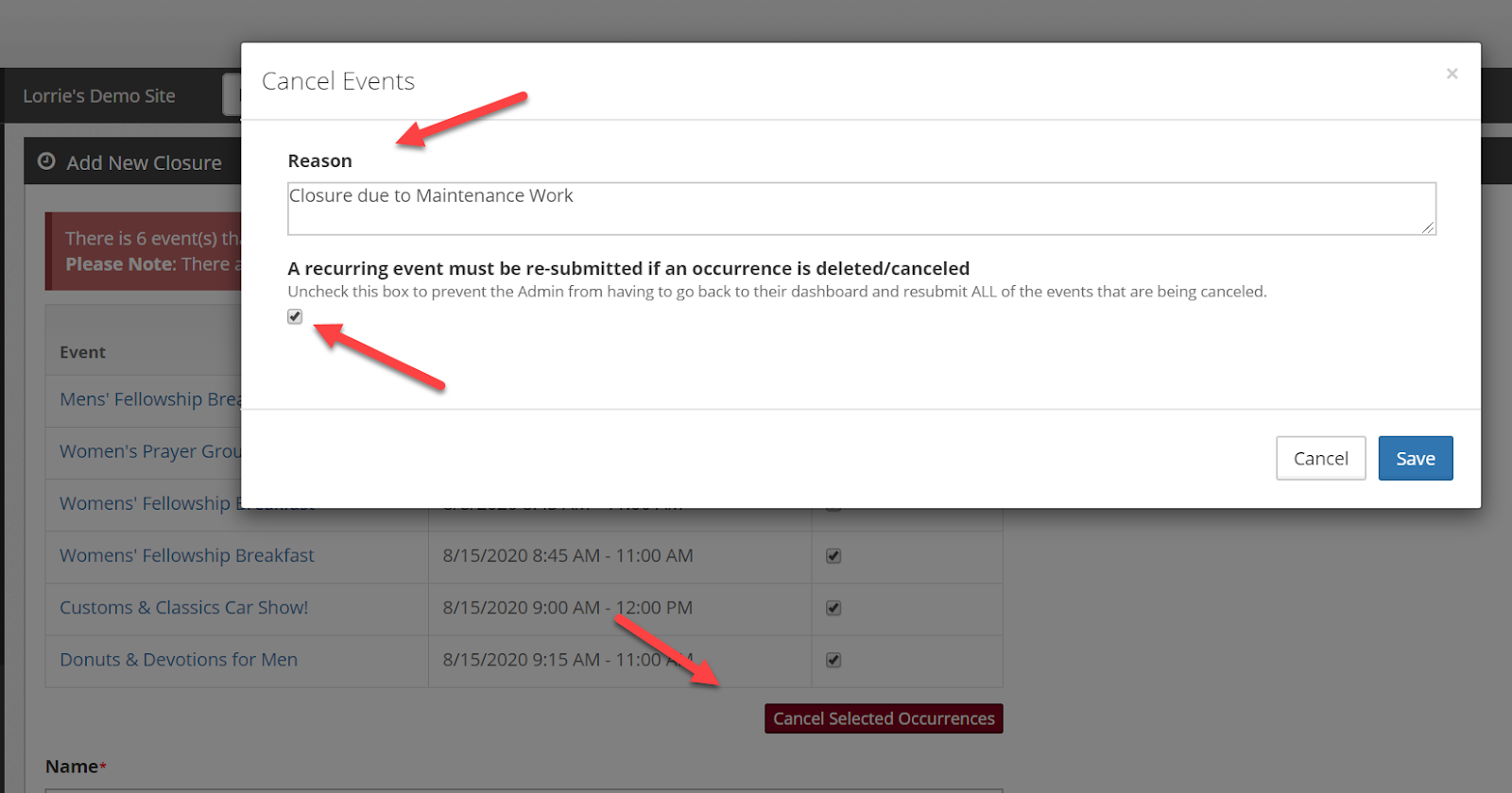 - This will prevent the Admin, event owner or event editor from having to go back to their dashboard and resubmit ALL of the events that are being canceled, especially if you have an emergency where lots of events are affected.