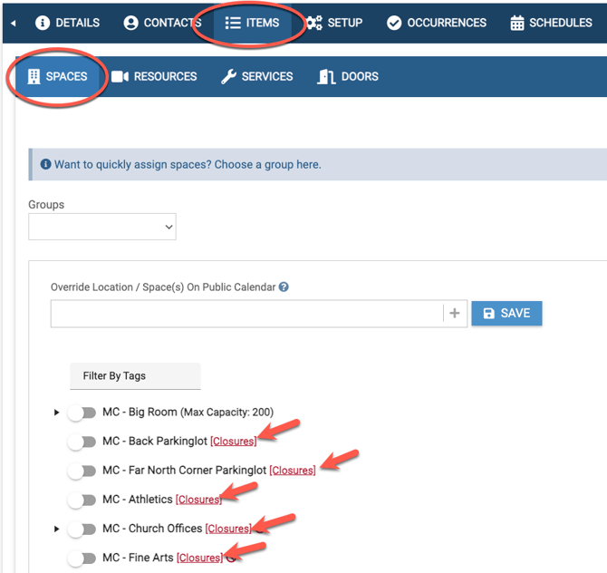 Closures are for a particular instance and time frame. Admins have the ability to close down a facility as a whole, OR by location OR by specific spaces, resources and/or services by toggling on "Is this closure specific to certain items". Admins are also the only ones that have the ability to override closures, meaning after making one for locations, spaces, resources and/or services, they can still create an event that conflicts and push it through approval!