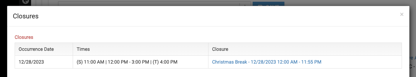 to see which dates and times an upcoming closure conflicts with their event or occurrences on their event.