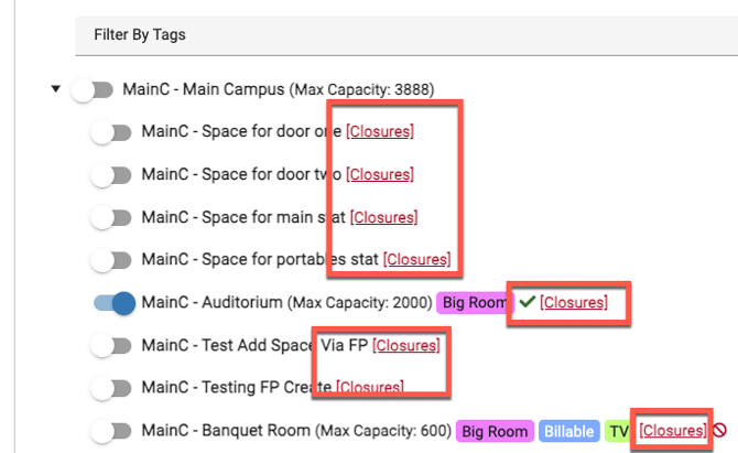 All users will be able to see if a space, resource and/or service is affected by an upcoming closure when they are choosing items on their event. For any items affected, they will see the word "Closure" next to it.