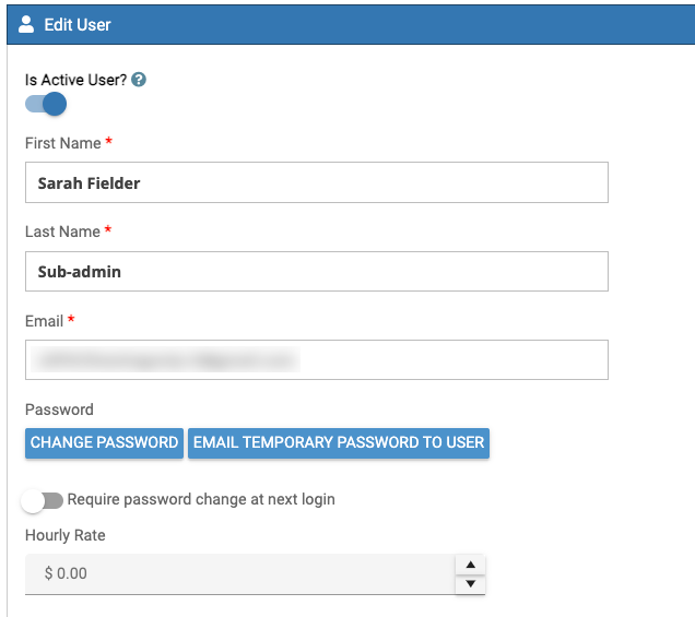 When you add a new user or click to edit an existing user, you will see the following fields where you can mark them as Active or not, their name, email address...