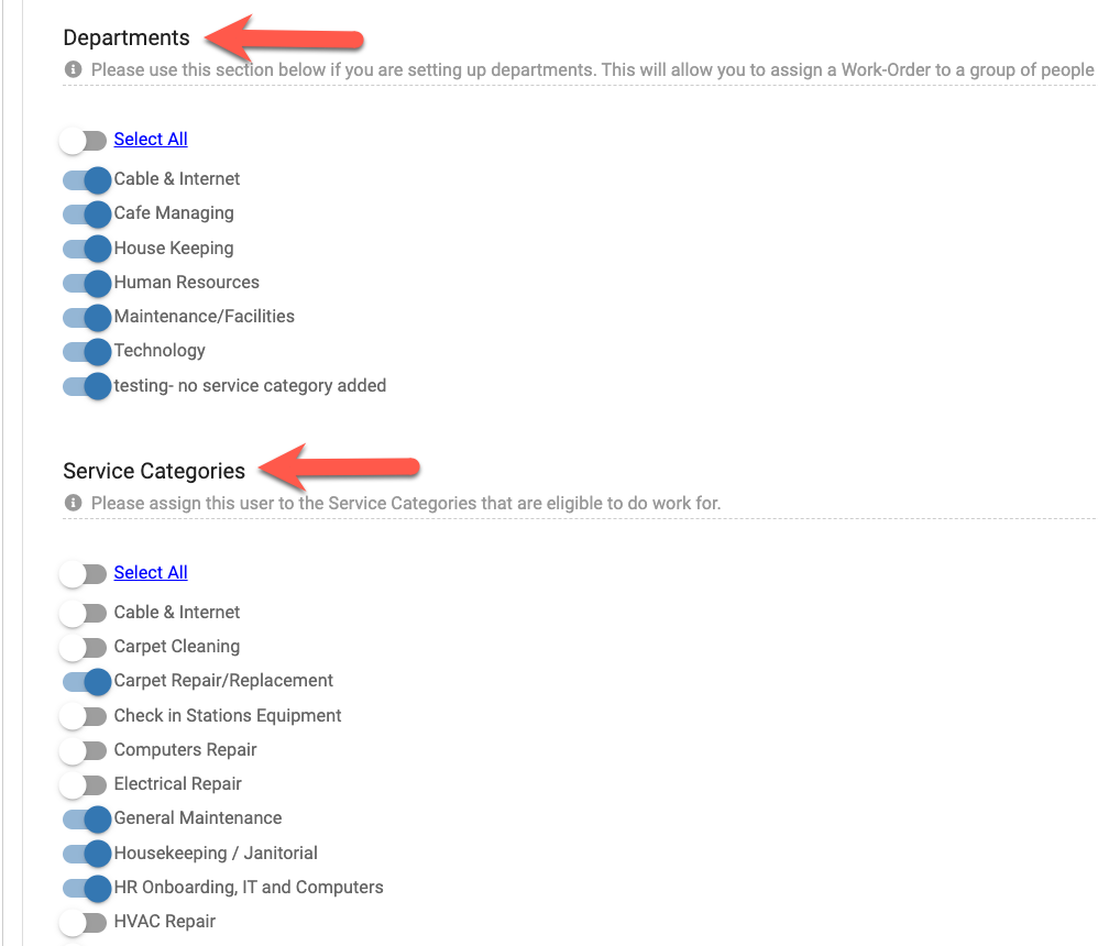 When a user has been given the ability to perform work under their user permission (A.), it's critical that an admin also make sure the users and sub-admins also have access to the right departments, service categories, and locations, under their user permissions (B.) in order for them to be assigned & view the right work orders.