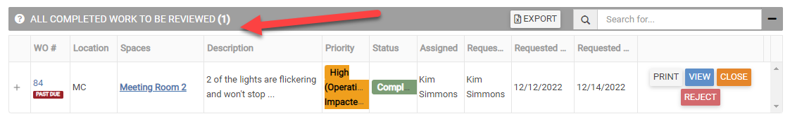 - Rejecting Work Orders: For any submitted work order request that is not yet assigned to a user/department/vendor, admins have the ability to "Reject" the work order as well and give a reason that will be sent back to the requester.
