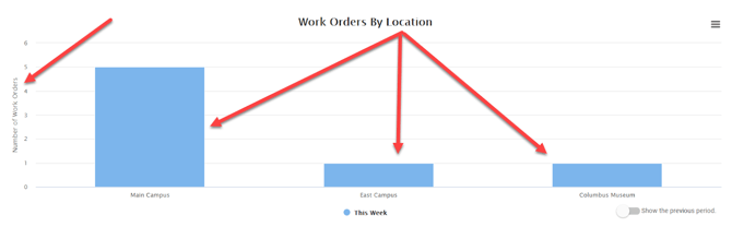 The section under the pie chart is a bar graph for Work Orders By Location with Locations displayed on the X axis and Number of Work Orders on the Y axis