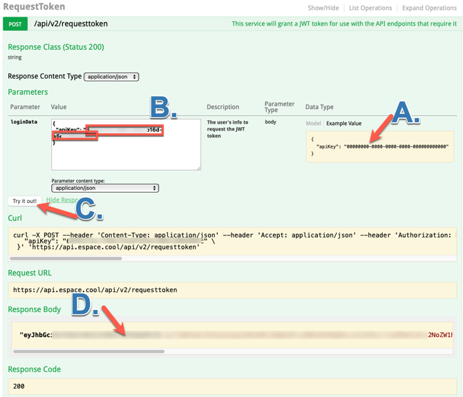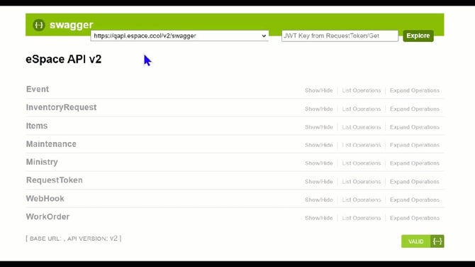 - In order for support to help troubleshoot, please email us the exact API call you are using along with the response you are getting when you test in Swagger from within your eSPACE account (see more below).