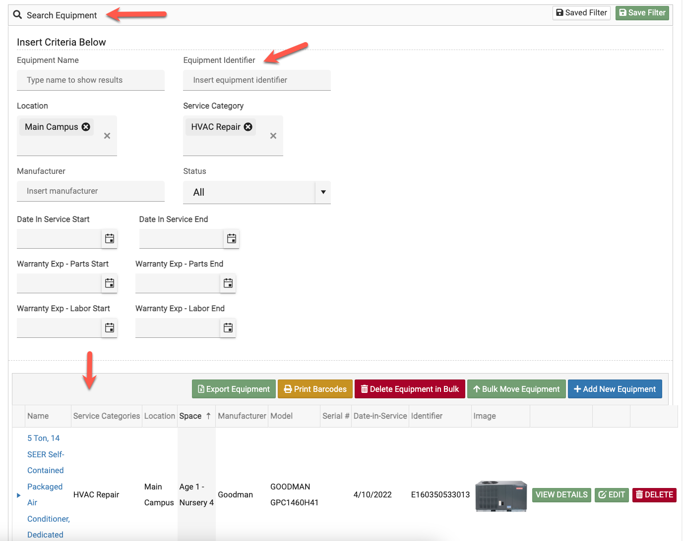 - Notice that a new filter has been added called Equipment Identifier (see attached image above). This is an identifier (barcode) that is unique to the piece of equipment that it is associated to that cannot be shared with any other piece of equipment or inventory item.
