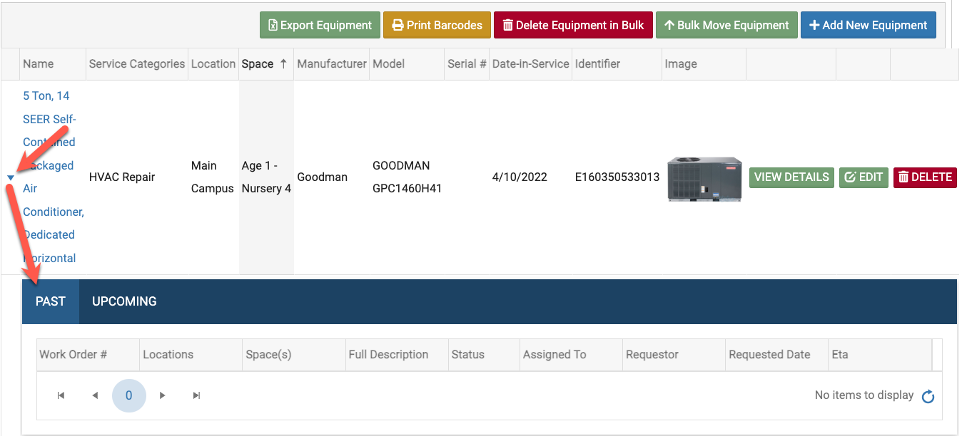 - When searching equipment and viewing equipment on the bottom of the page, you can expand the equipment item by clicking the expand button (+) to see all Past and Upcoming work orders it is associated to.
