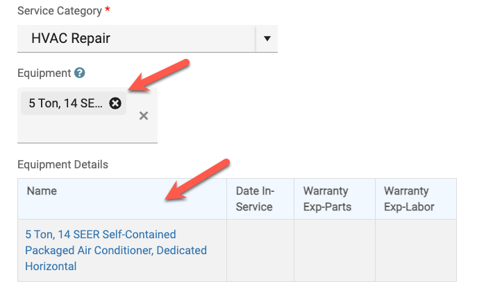 - Once the equipment has been added to the work order, you will then see the Equipment Details displayed (see below).