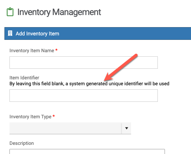 When adding and managing inventory, you will have an additional field to add your own Item Identifier (Item ID) or leave it blank and a system generated unique identifier will be used. This will generate a barcode for the inventory item.
