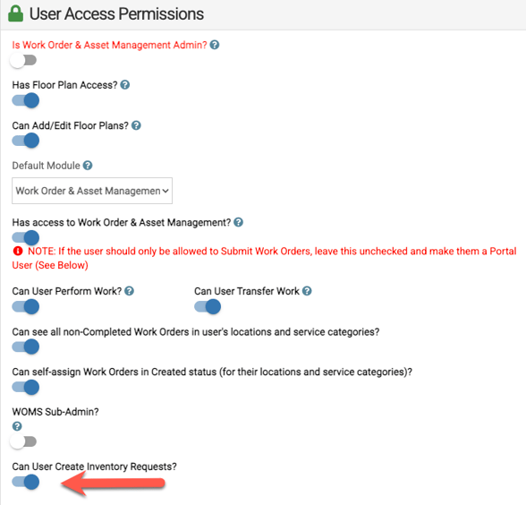 - Go to User Access Permissions and check the box for Can User Create Inventory Requests?
