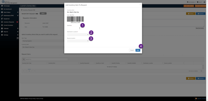 For those that are on an eSPACE subscription tier which includes Asset Pro, begin by clicking on "Inventory Request" at the top right of your Work Order & Asset Management Dashboard.