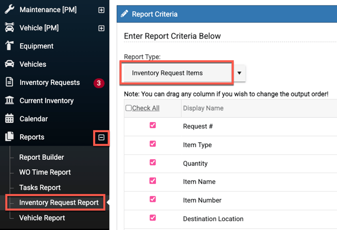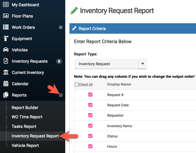- Admins, sub-admins, and regular users can all run a report to see inventory requests in the desktop view of Work Order & Asset Management. This option is located in the left side menu under Reports.