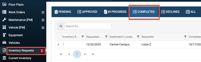 - You can see all the complete inventory requests under Inventory Request when selecting the Completed tab. While all inventory requests will show on the report, only those that are marked as completed will have a quantity included.