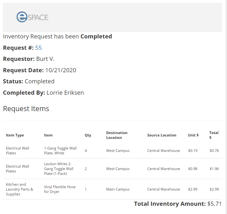 For those that are on an eSPACE subscription tier which includes Asset Pro, you will see two columns (Unit $, Total $) within the "Inventory Request has been Completed" notification. The notification also includes the Total Inventory Amount! This applies to all admins as well as sub-admins who have been given the ability to manage inventory requests under their user permissions.