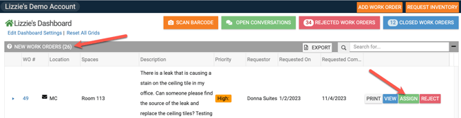 - If they do NOT assign the work order during the creation process then the work order will appear in the "New Work Orders" grid. They can then assign the work order at that time and the work order will move to "All Work Orders in Progress" and "Non-completed Work Orders" grid.