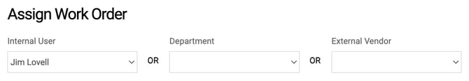- When admins enter a work order, they can choose to assign it right away to an individual user, a department (if the account has departments), or an external vendor.