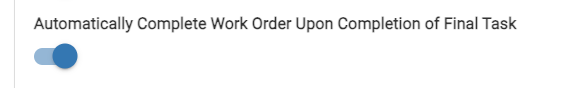 Admins, within Settings > Advanced > General > Work Order Workflow, can enable "Automatically Complete Work Order Upon Completion of Final Task".