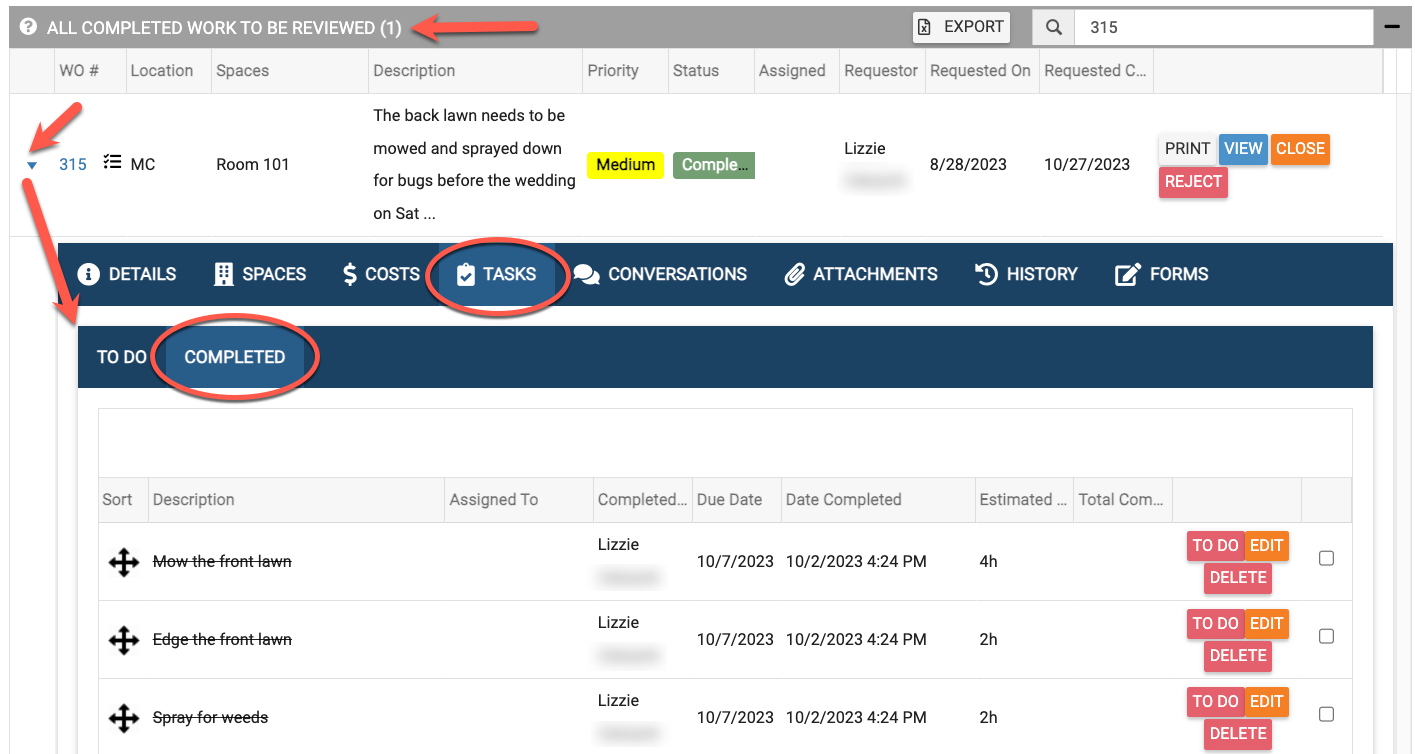 With this setting enabled, when a work order is requested and tasks are associated, once the final task within the work has been marked COMPLETE, the work order will automatically update to the "COMPLETED" status and be visible under the All Completed Work To Be Reviewed grid. Once the admin has reviewed the completed work order, they can update the status to "Closed", thus moving it from the dashboard.