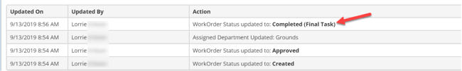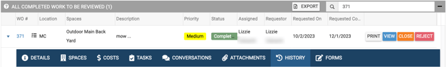 Also, the completed work order status will be reflected within the History tab of the work order.