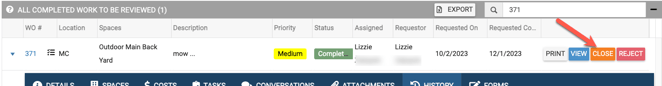 Any Admin who has been given permissions for the Service Category and Location associated with the work order, can then choose the green Close button (see below) to close the completed work order.