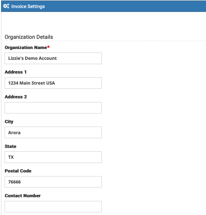 - A. Under Billing & Invoicing > Settings > Invoice Settings you can add your Organization Details (Name, Address, Contact Number).