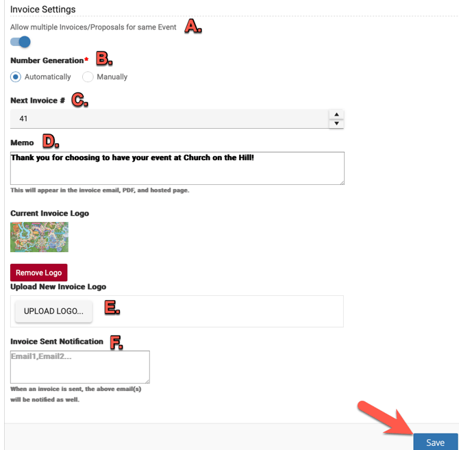 - F. Upload a Current Invoice Logo to display on the invoices that get sent out to people.