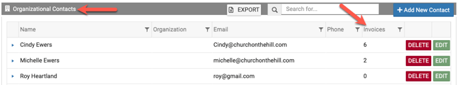 Under Billing & Invoicing > Settings > Contacts is where you can manage all of your contacts (add new contact, edit contact and add note, delete contact and search). For each contact, you can view and filter by Name, Organization, Email, Phone and Invoices. You can export your contacts to Excel!