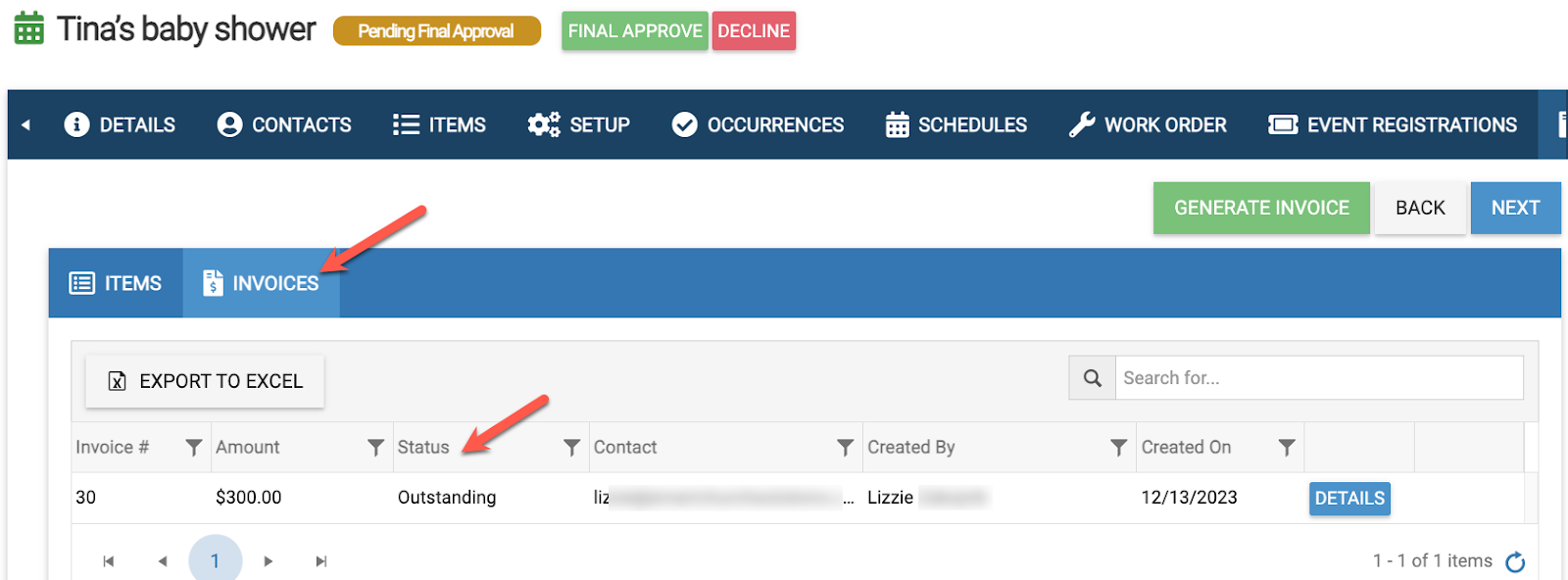 Once an invoice is generated, the status of it can be tracked in the Billing & Invoicing module as well as the event on the Billing tab.
