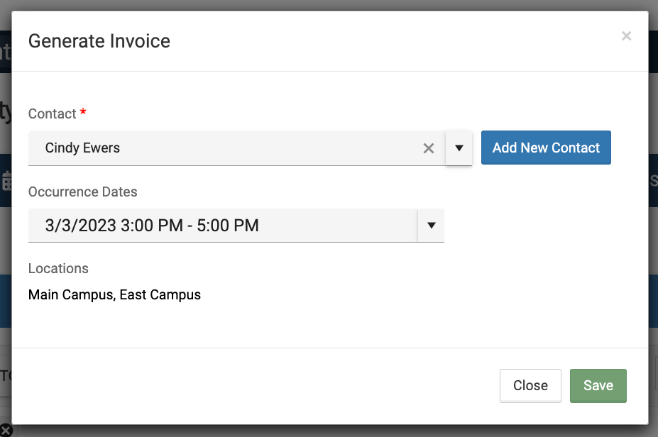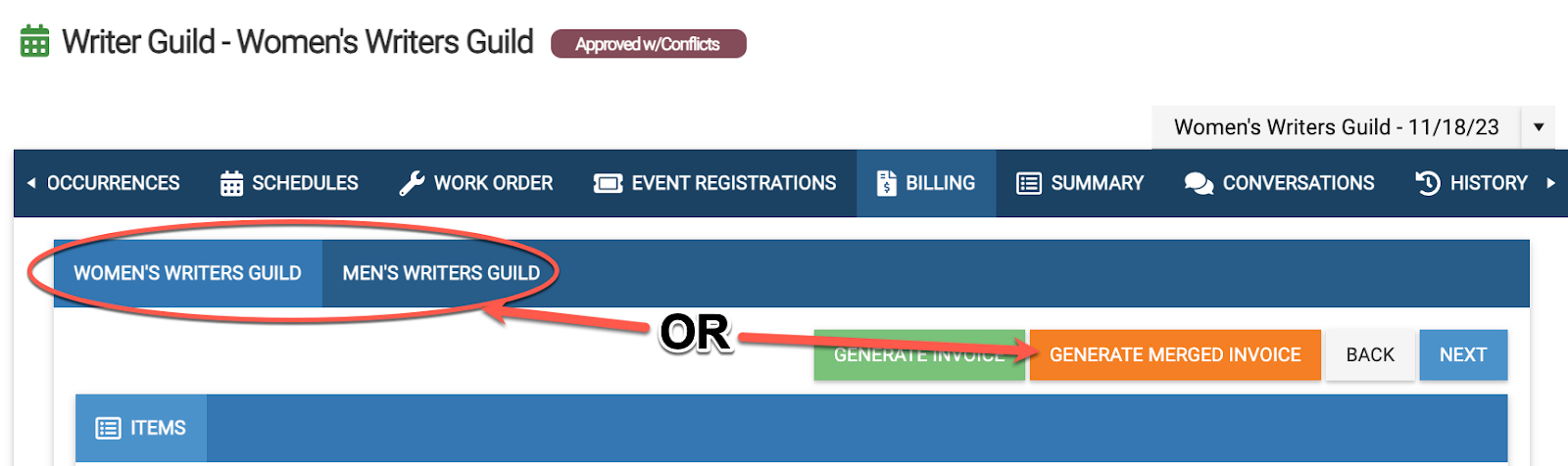 If your event has schedules on it or overridden occurrences, then you can either generate an invoice for each schedule on the event or choose to merge them.