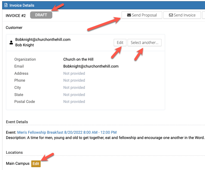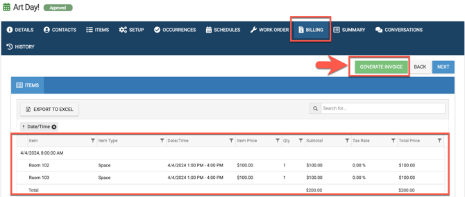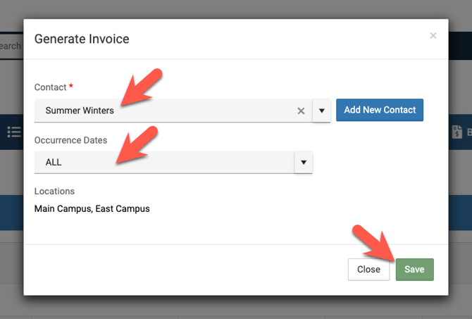 • When creating an invoice on an event you can choose to either generate the invoice for one OR all the occurrences. After the invoice is created you can make any additional edits that you need on the invoice in the Billing & Invoicing section under the Invoices section. Read more below.