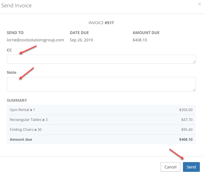 • When you click on Send Invoice, a new window will open where you can review the invoice and carbon copy the invoice to others. Simply separate each email by a comma! You can also include a note. When you are ready, select SEND.