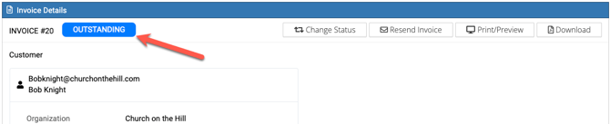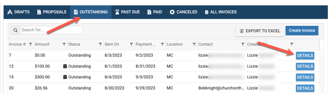 If an invoice is being paid by check or cash, you can manually change the Outstanding status to Paid by clicking the blue Details button to the right of the outstanding invoice (shown below).....