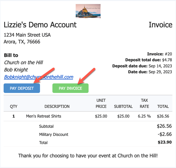 When you send the invoice, the customer will get another email from eSPACE with the invoice and the options to either pay the deposit (if there is one) or pay the invoice.