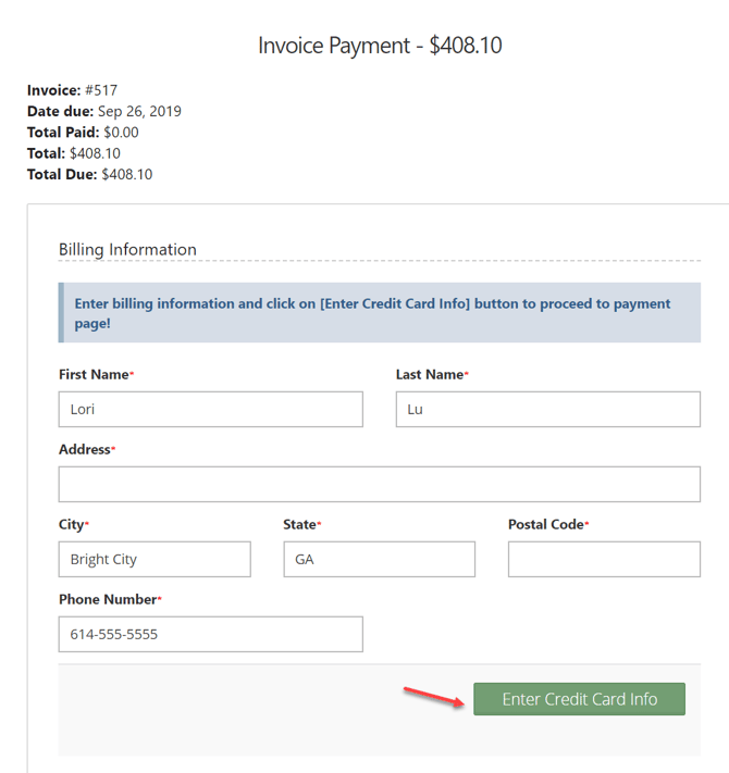 • When they click on PAY INVOICE, they can review the invoice and choose Enter Credit Card Info to add their credit card information...