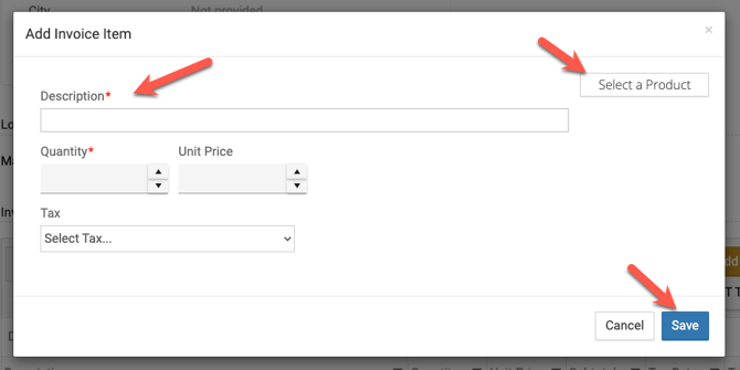 A window will open where you can choose Select a Product to select an existing product or you can add a new invoice item and SAVE (see second attachment).