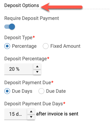 5. If you want to Require a Deposit, be sure to select this option below Deposit Options. You will then be able to choose a Deposit Type. You can select Percentage and add desired percentage OR you can select Fixed Amount and add desired deposit amount.
