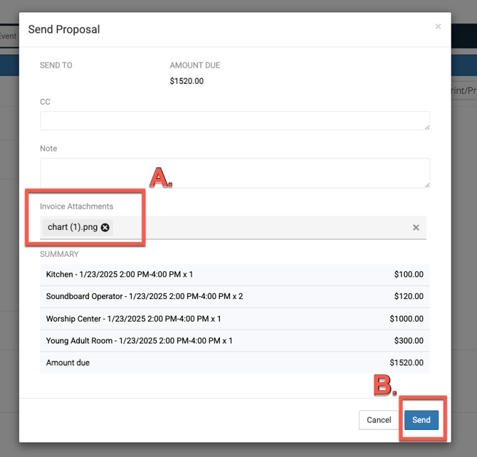 Once attachments are added to the invoice, you can also choose to add them to the email that gets sent to the end person.