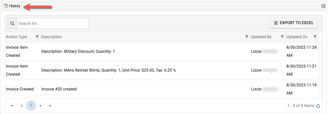 Each invoice has a history log where you can view changes made to that invoice. Just click t expand the "History" in order to see the changes. You can also search for changes in the search bar as well as sort and filter within any of the columns. Click in a column header in order to sort and click the filter icon in the column header to see the pop up box with the filter options. You can also export the history to an Excel file.