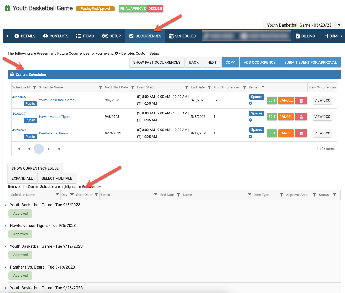Begin by creating an event with multiple occurrences and/or schedules like the one below.