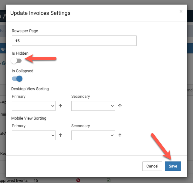 - Then select Edit for the "Invoices" grid and toggle off "Is Hidden" and SAVE so this grid is visible on your dashboard.