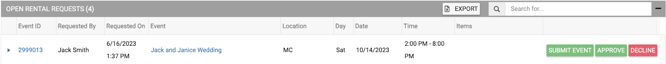 Once a billable Event Request Form is filled out and submitted, then those submissions will appear in the "Open Rental Request" grid on the Dashboard of any user that has access to Billing & Invoicing and is selected as a manger of that form. ![]()