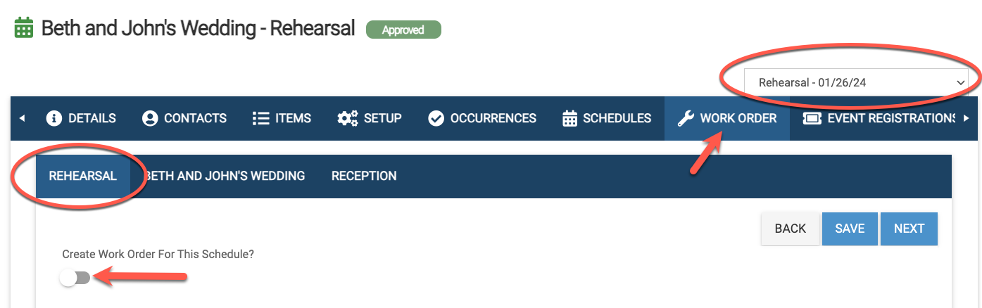 - See below the "Rehearsal" schedule is selected, but there are 2 other schedules on this event. You can set up all 3 of these schedules to generate a work order, or just 2 or just 1 of them.